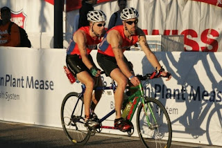 We managed to make it to the home stretch before the male pros came flying by us. Most of them cleared us before we hit the swim exit. We stayed to the right so as not to get in there way. Out of the swim we headed to transition and the volunteers helped us remove our wetsuits. Ryan got a little tangled in the tether so it took a little bit to get going, but not a big deal. I believe our swim split was in the 33min. range.