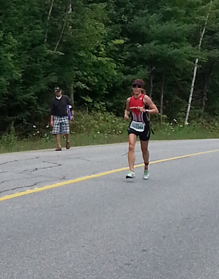 Back to the bike. Just past the 10km mark I got passed by a girl in my AG. This seems to be recurring theme in races and further evidence that I really need to work on my cycling. I tried to keep her in my sights but she was a strong rider. I really hoped she wasn’t a good runner. I motored along, keeping my eyes peeled for any other women that passed me. There weren’t any thank goodness, only speedy old guys who can’t swim to save their lives, ha ha. Other than the few climbs and the discomfort late on the bike, I felt I rode fairly strong. The last 500m or so is a screaming downhill into transition so I let it rip until I had to make the sharp turn. Daring for me, as I’m usually on the brakes. I hopped off my bike and booked it into transition.
