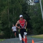 minutes. We were escorted to the start line by pipe and drum bands. This involved a walk of about 1.6kms and served as a good warm up and mood setter. The route itself seemed somewhat circuitous and took us through many Perth neighbourhoods and along many streets of the historic downtown area. There are not many hills to worry about on this course and plenty of well manned water stations. Sadly, I did not see one porta pottie at any of the water stations or along the course. So make sure you make good use of those by the start. Most of the race is on streets but around the 6K mark we leave the road for gravel and enter a trailer camp ground. This is where the Warrior adventure begins. The first challenge was a tire obstacle run. Shortly after this the warriors had to throw a war hammer. Then on to the caber toss. The final challenge had the warriors crossing a river to a small island. They could wade through the water or try to keep their running shoes dry by making their way to “Scotch Island” by going hand over hand on the line suspended over the river. Once on the island they had to ring a bell and then make their way back to the mainland to finish the race.