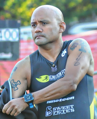 Sharing a chuckle with John Salt about my horrible swim – Mike Cheliak on the spot again to capture the moment.