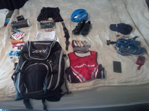 Two pair of shoes (cycling & running)… Wetsuit… Helmet… Tri kit… Nutrition… Towels… Bottles… Etc…etc…