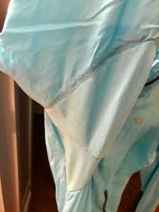 There is a drawstring at the back of the neck which is very convenient to pull on while in motion as well as two around the waist. The back of the jacket dips a bit lower for great wind protection on the butt and hides it if that’s important to you (like it is to me!!) Two side pockets with zippers and two inner no zipper pockets make this jacket great for holding everything you need!