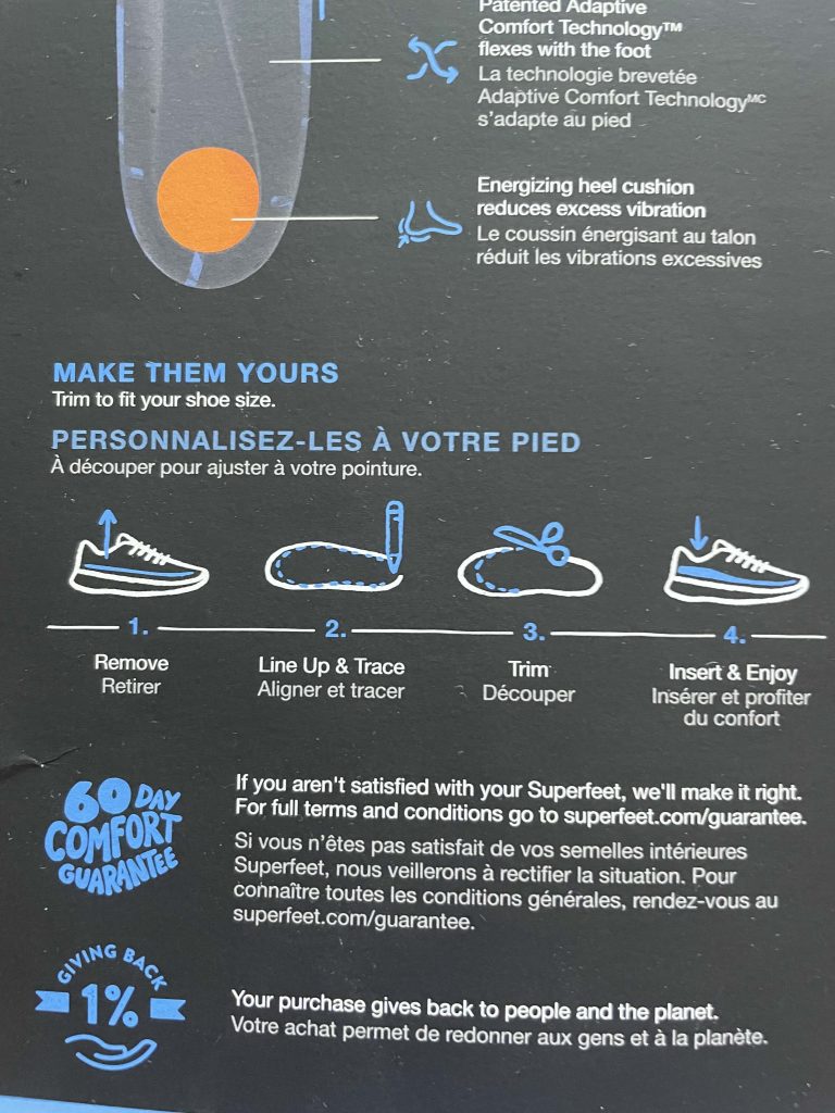 The installation process was also pretty straightforward. You just remove your original insoles, place them on top of the new Superfeet ones, trace the shape, and cut along the outline so they fit properly inside your shoes. There are clear step-by-step instructions on the packaging, and it only took a few minutes.