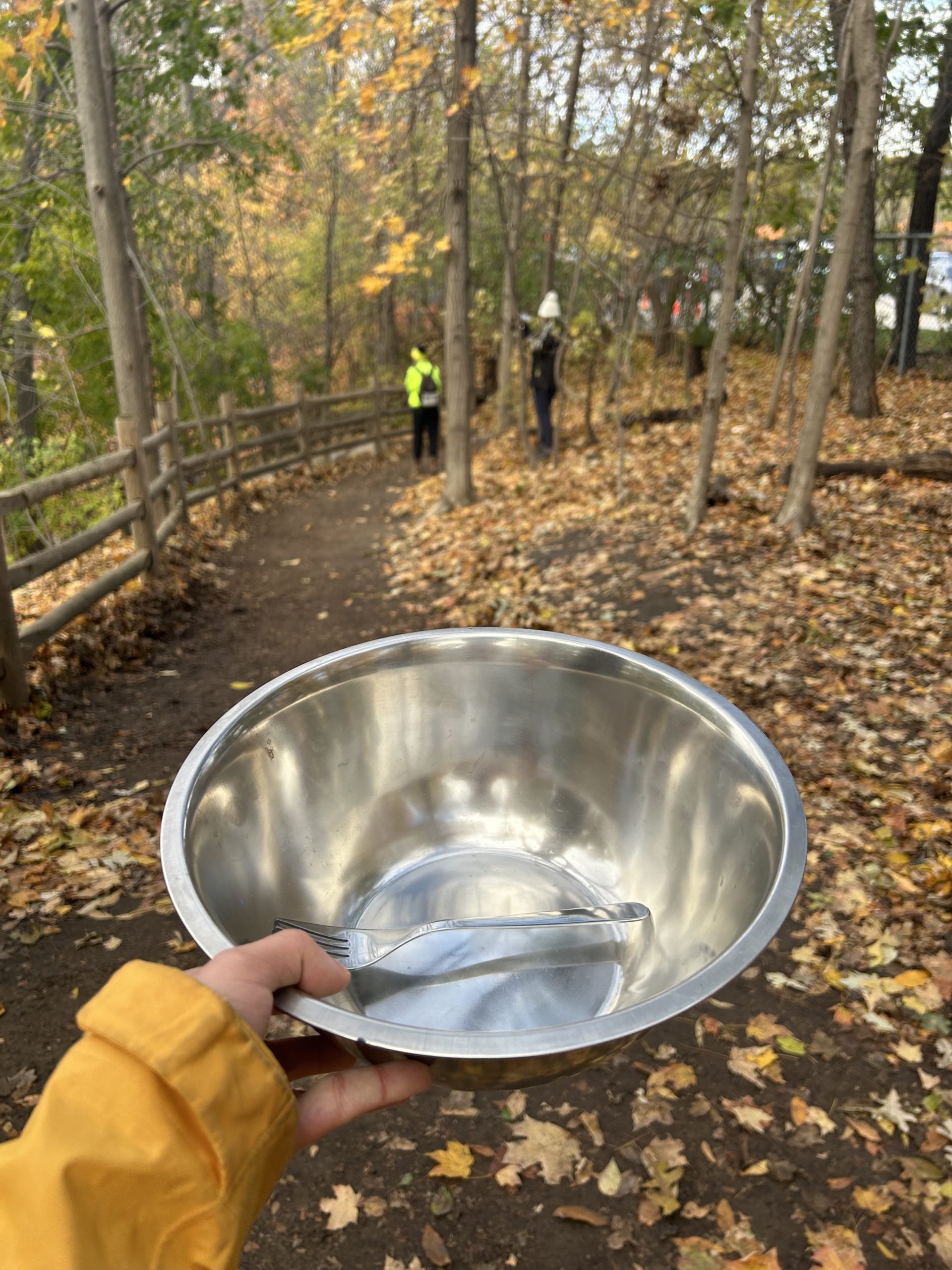 This race was originally 7K long, but due to the construction, it has been cut down to 6K. After the first descent, the course immediately enters the Metrolinx construction site, which has put a major crimp in trail access for the past year and for several years to come. Some of the course marshals guided us to run on one side, as we were sharing the roads with the construction vehicles. The course consists of about 1K of concrete road and 5K of muddy trail. There are only a couple of hills that are about 5–10 meters tall, and the rest are super flat and runnable, so some of the serious runners actually wore carbon-plated road shoes for this race. Plus, the course is not technical at all; it is pretty smooth and straightforward. If you have joined the Toronto Trail Runners before, you should be fairly familiar with the course. Throughout the course, the sharp orange course marking along the route was really clear, despite most of the course being covered in fall leaves.