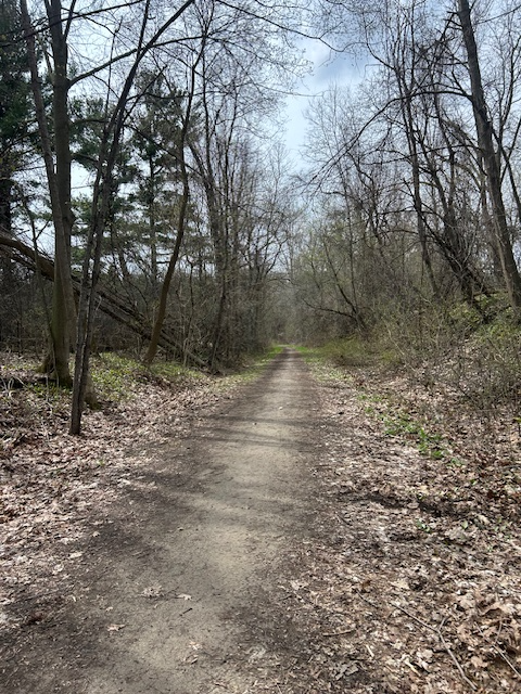 The trail itself is beautiful in that quiet way. Long straight stretches through forest, little openings with ponds and creeks, and everything just starting to turn green. That early spring feeling where the air smells fresh and damp and you can feel the season shifting.